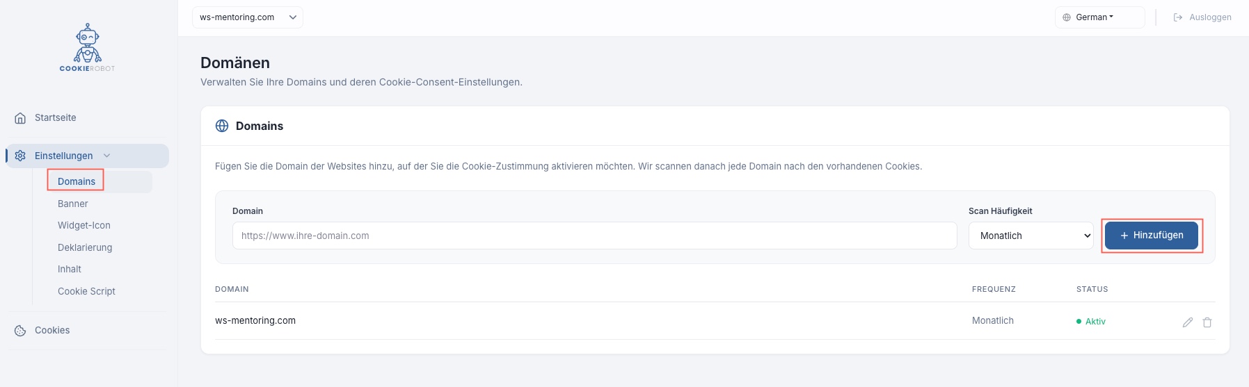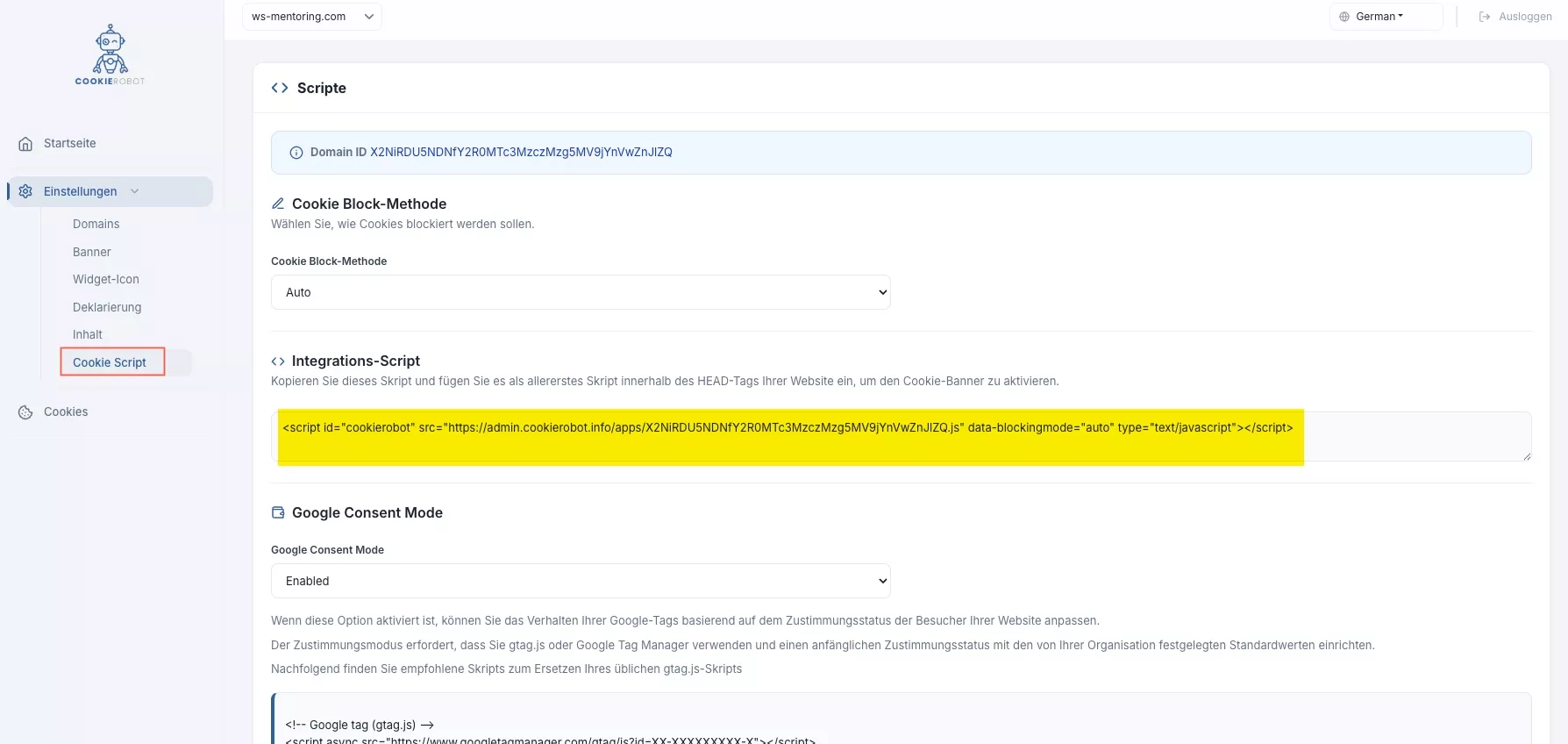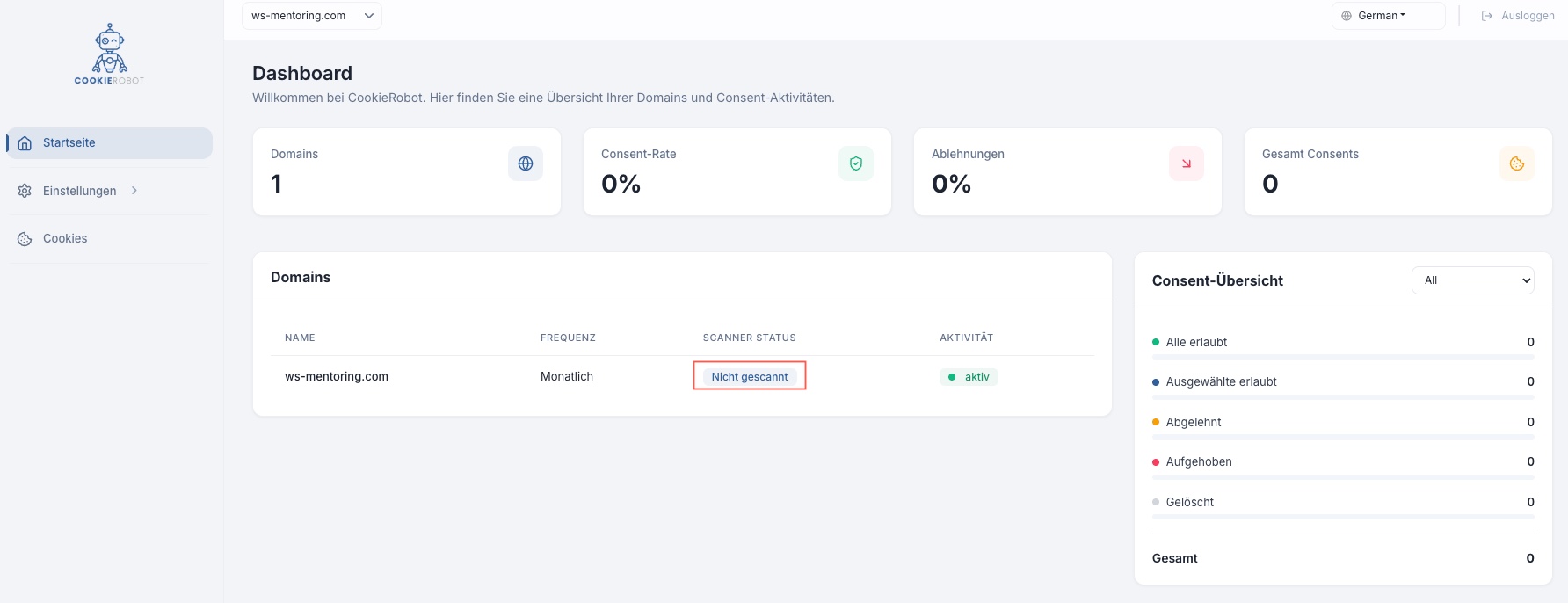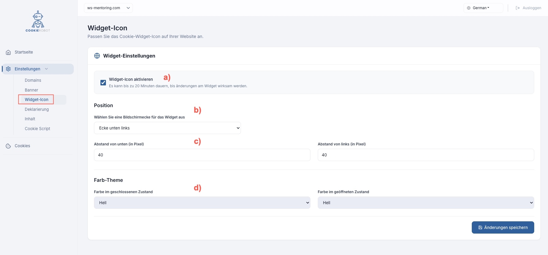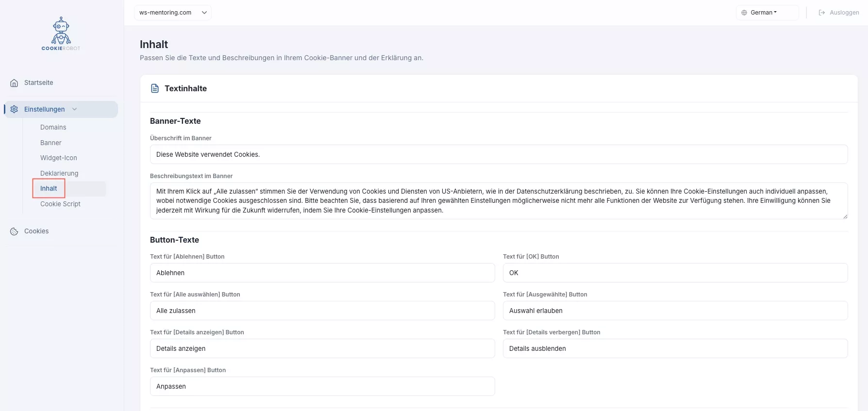 Hier finden Sie die Einstellung des Cookie-Banners der später auf Ihrer Website angezeigt wird.
