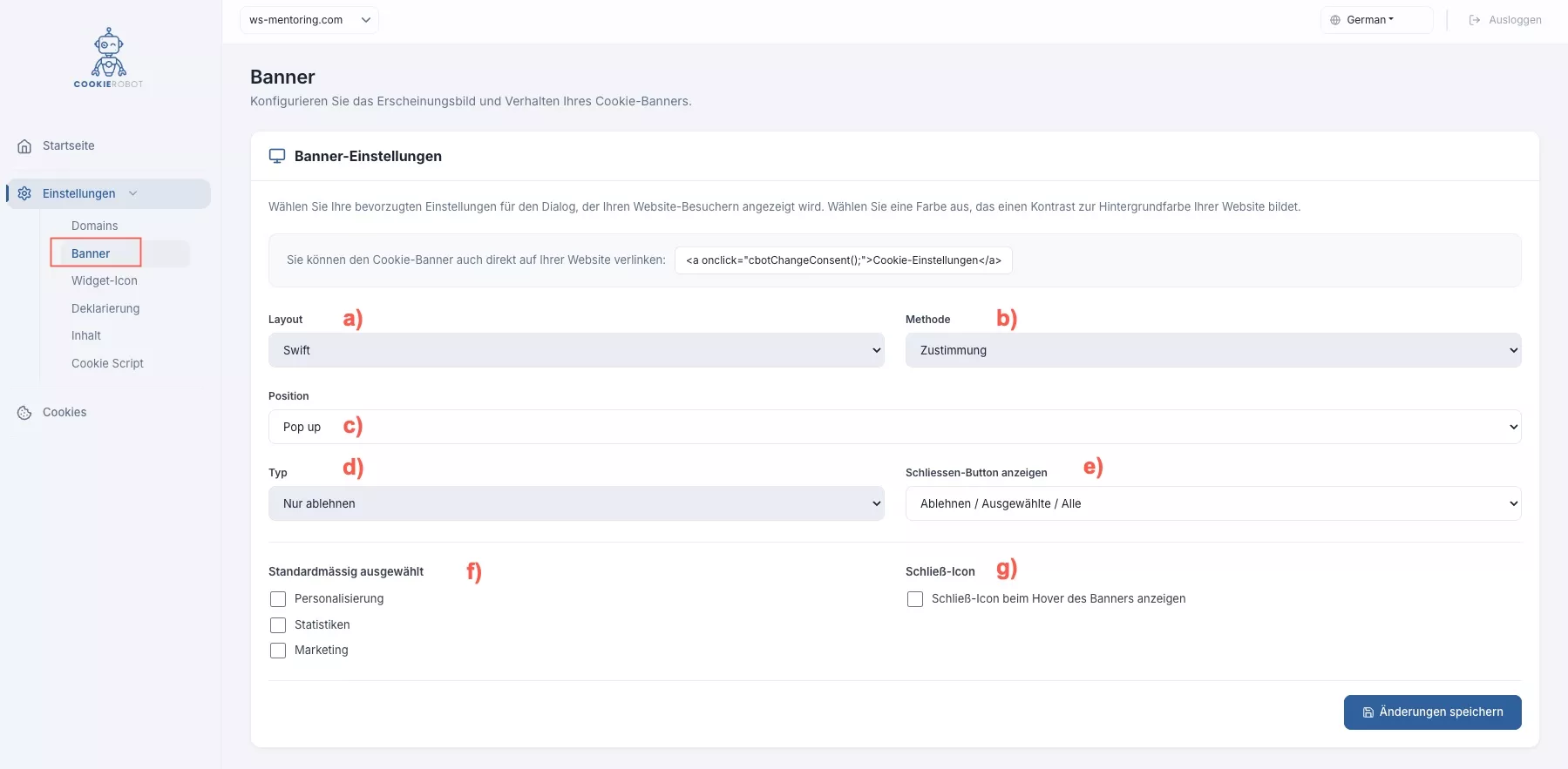 f) Hier können Sie festlegen, welche Cookies im Banner automatisch zur Zustimmung ausgewählt werden.