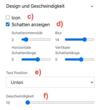 d) Wenn Sie möchten das um das Element ein Schatten angezeigt wird dann aktivieren Sie diese Einstellung.