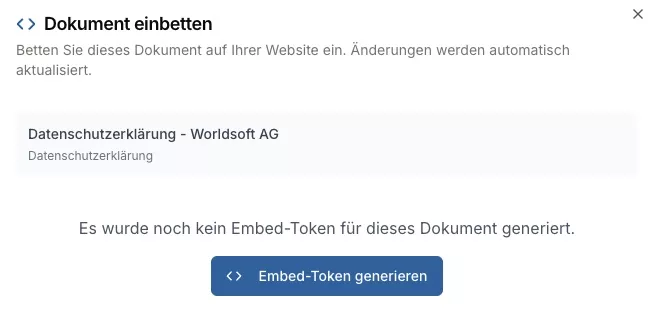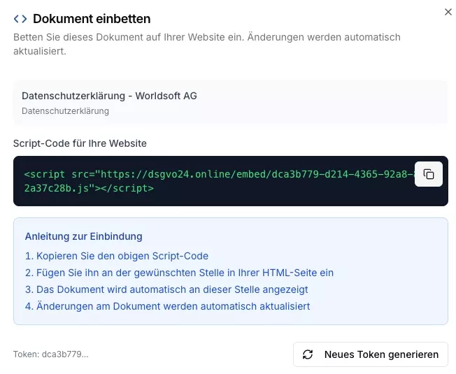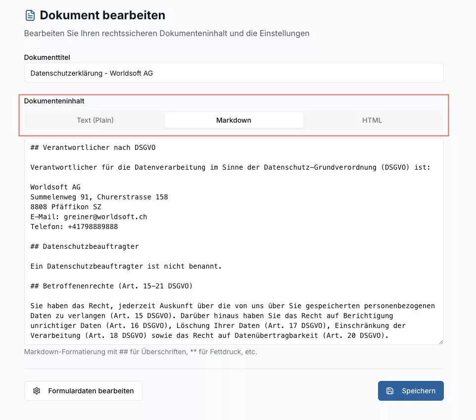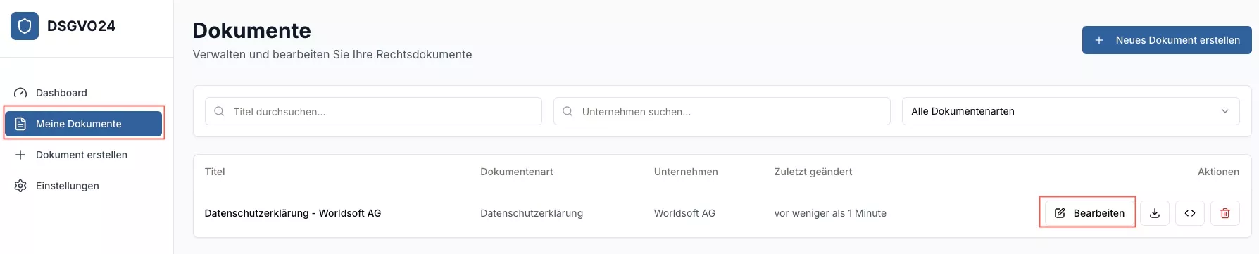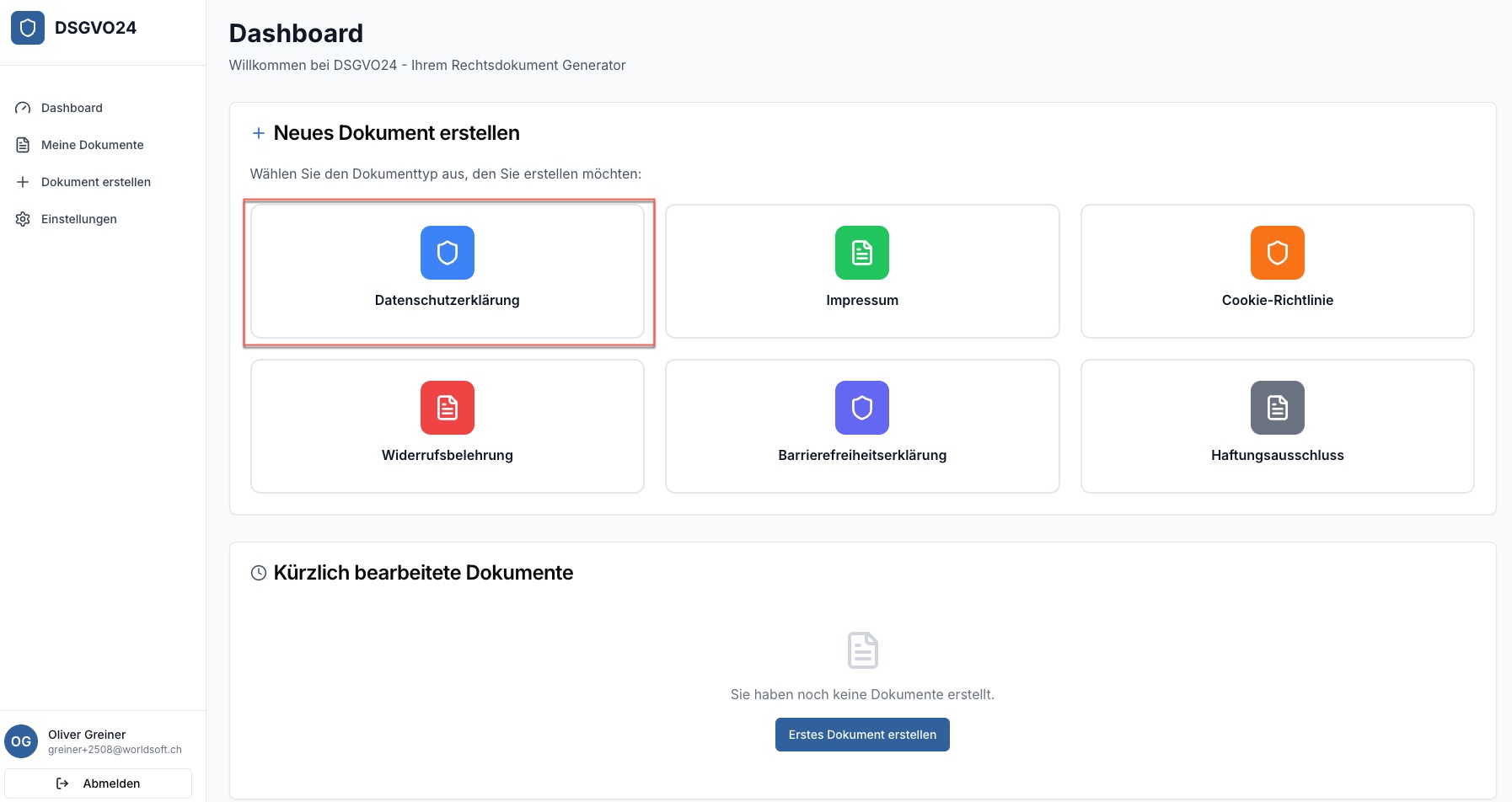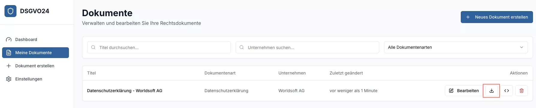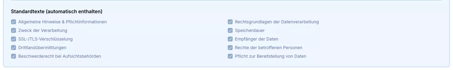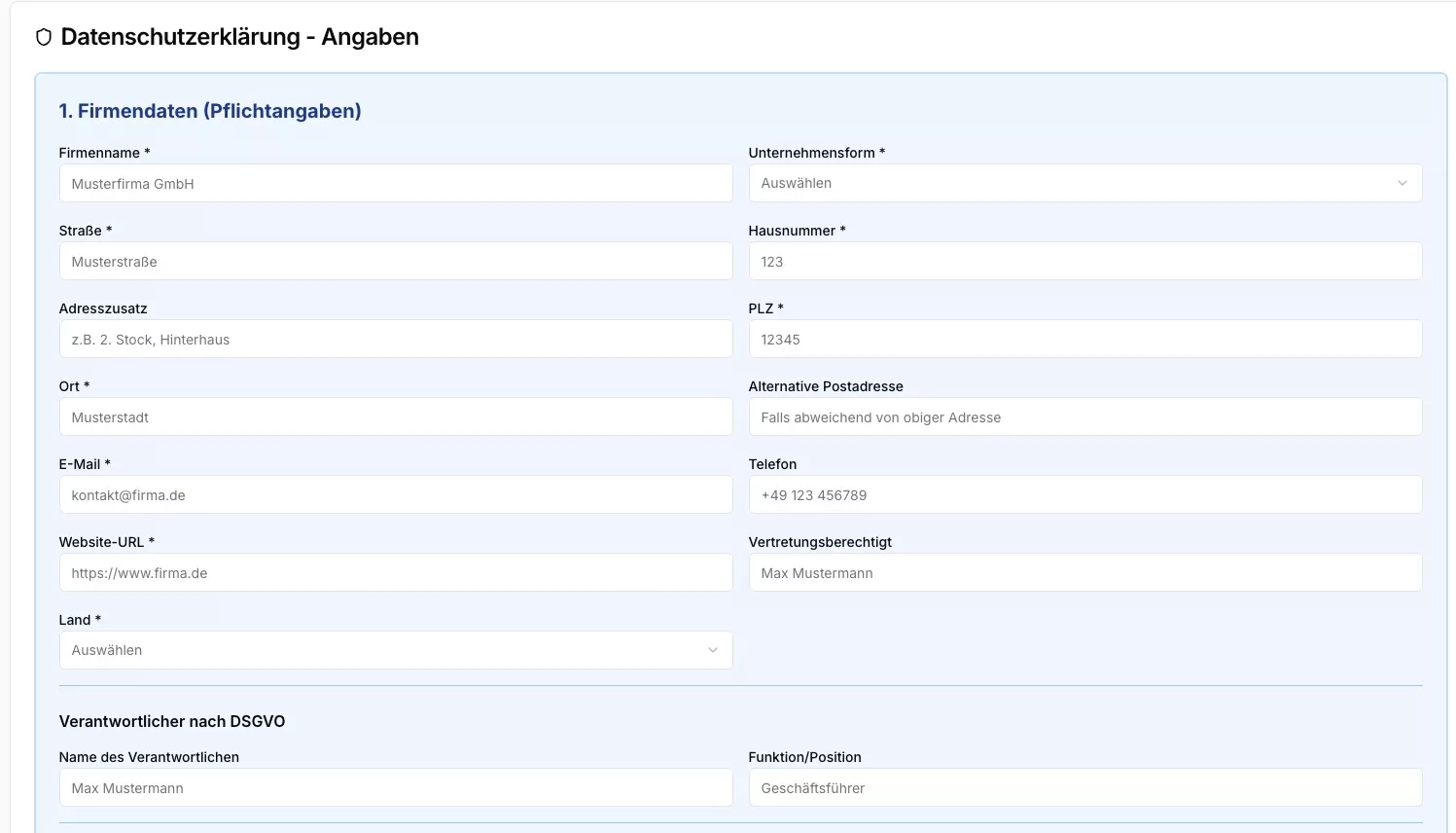 Nach Abschluss der Angaben wählen Sie „Dokument generieren“, um die Datenschutzerklärung zu erstellen.