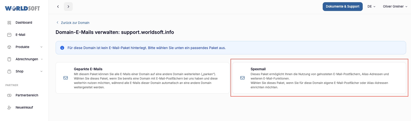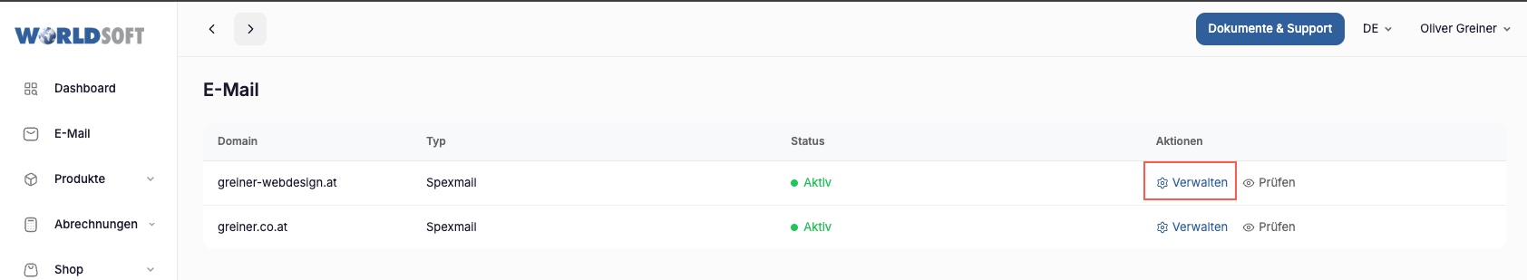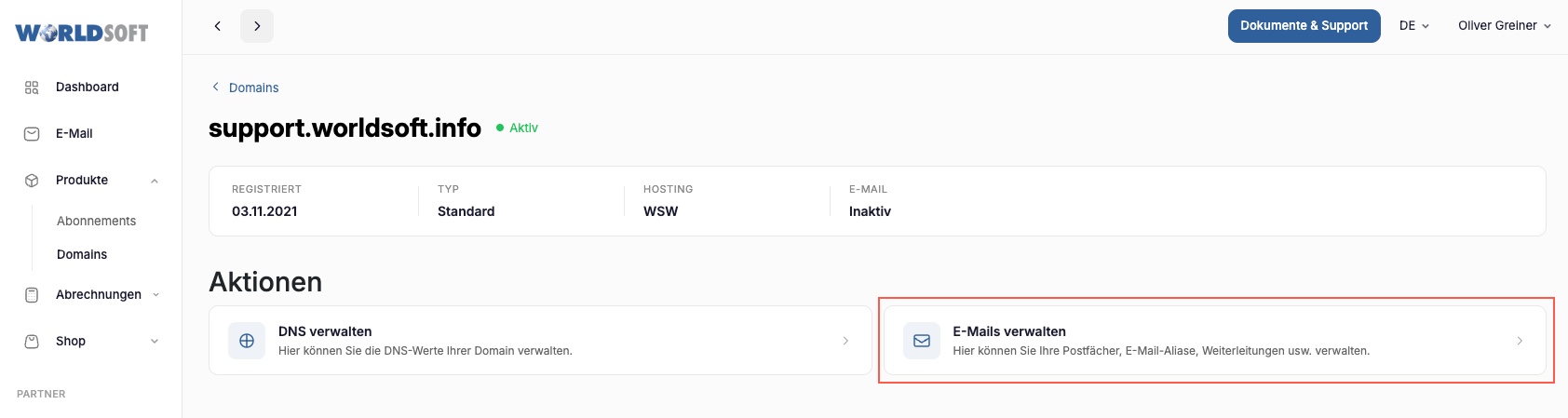 e) Mit dem Klick auf "Verwalten" kommen Sie in die E-Mail Verwaltung. Bei "Prüfen" werden die DNS Einstellungen überprüft. Wenn eine Domain neu eingekauft wurde müssen Sie auf "Aktivieren" klicken um E-Mails einrichten zu können.