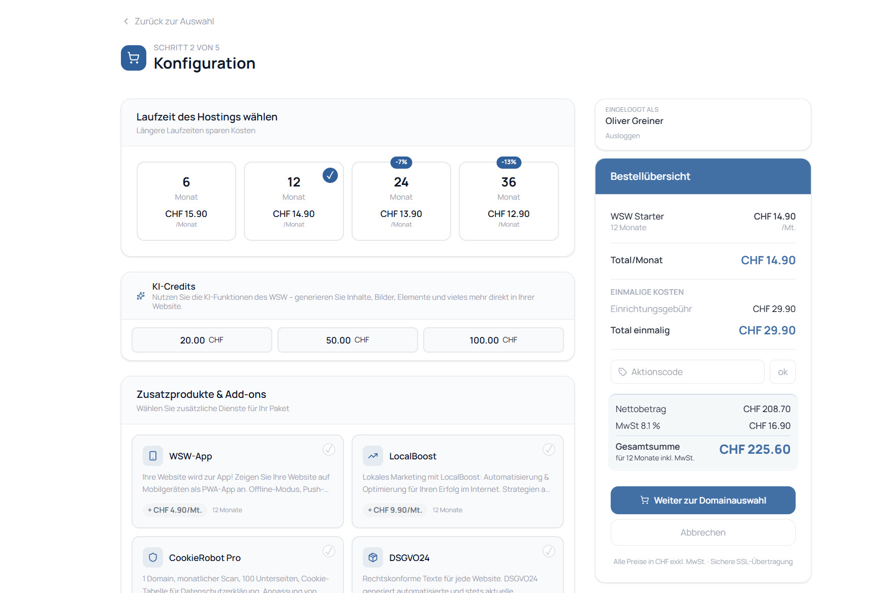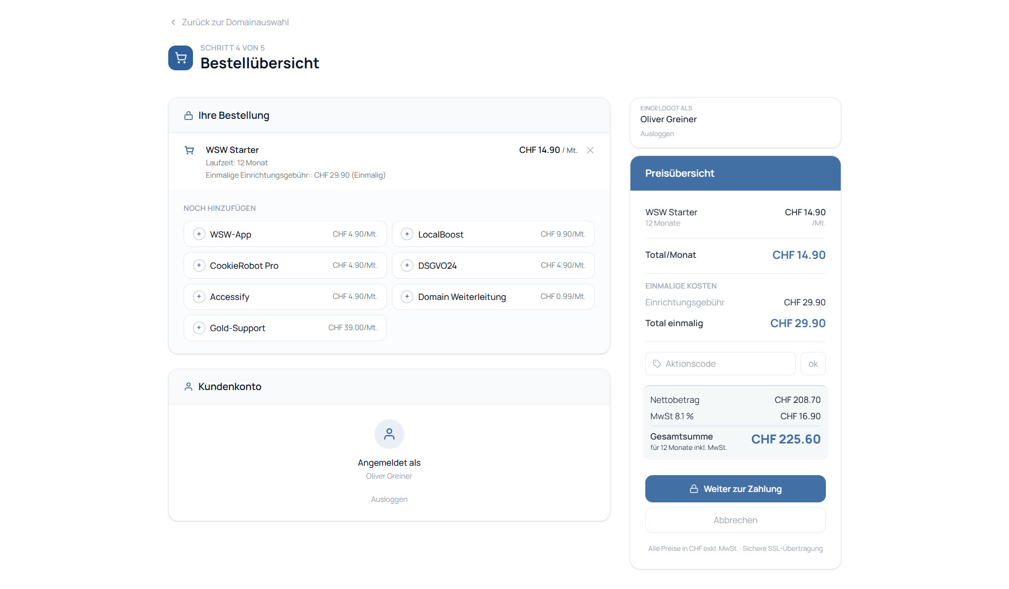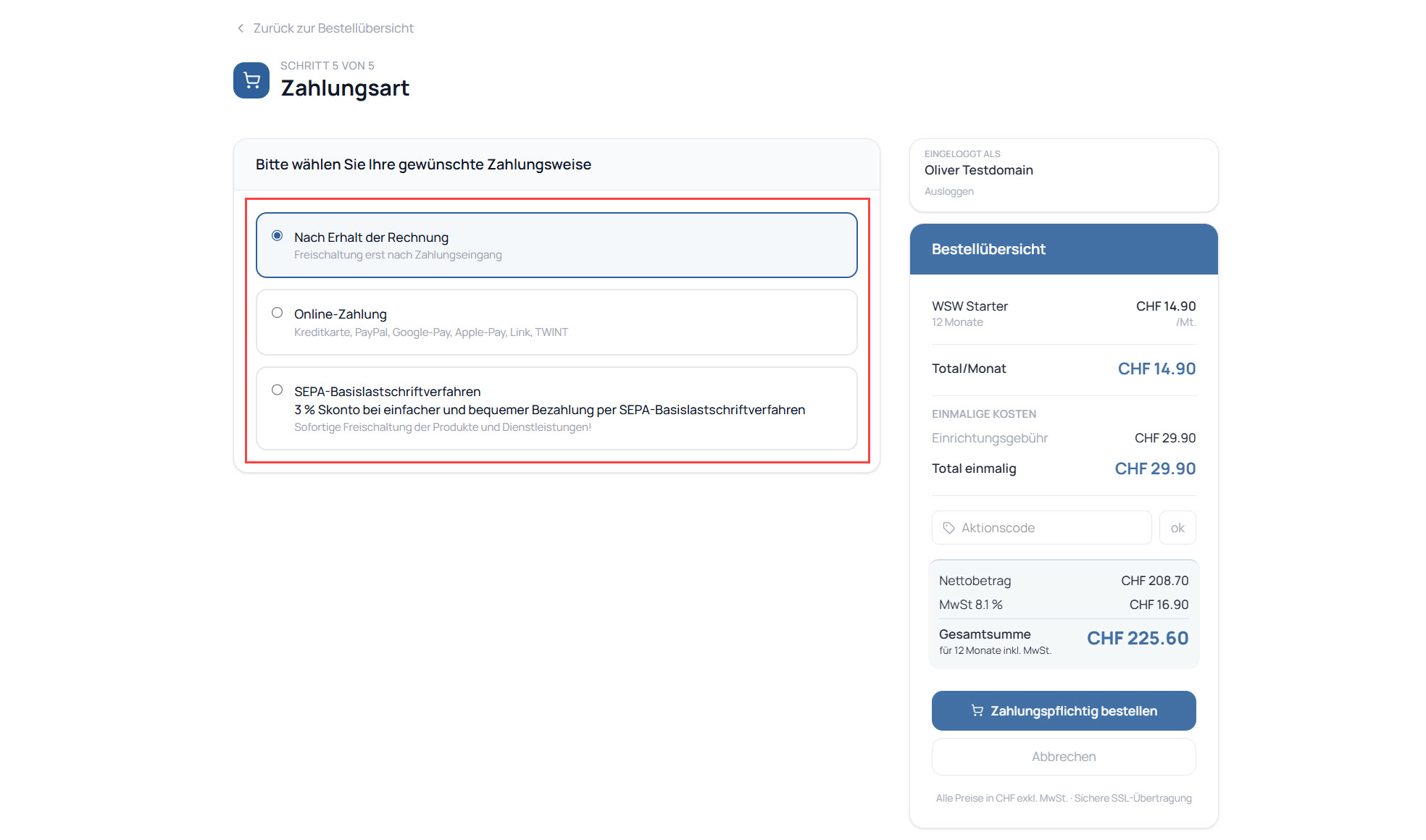 Nun wählen Sie die gewünschte Zahlungsart. Sie können zwischen Zahlung per Rechnung, Online-Zahlung mit verschiedenen Anbietern wie Kreditkarte, PayPal oder TWINT sowie dem SEPA-Lastschriftverfahren wählen. Nachdem Sie Ihre bevorzugte Zahlungsmethode ausgewählt haben, schliessen Sie die Bestellung verbindlich ab.