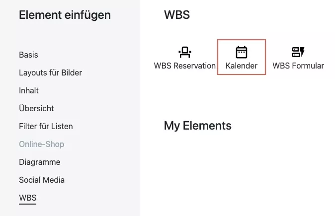 Wählen Sie das Kalender-Element aus um das Element in einen Bereich in Ihrer Website einzufügen.
