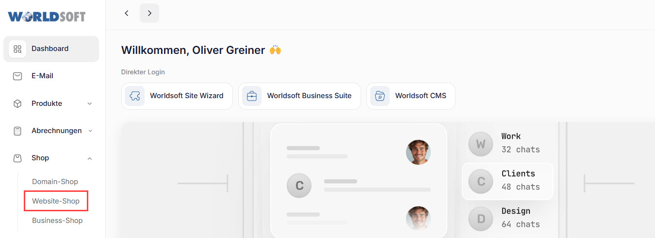 Klicken Sie auf "Shop" und anschliessend z.B. auf "Website-Shop".