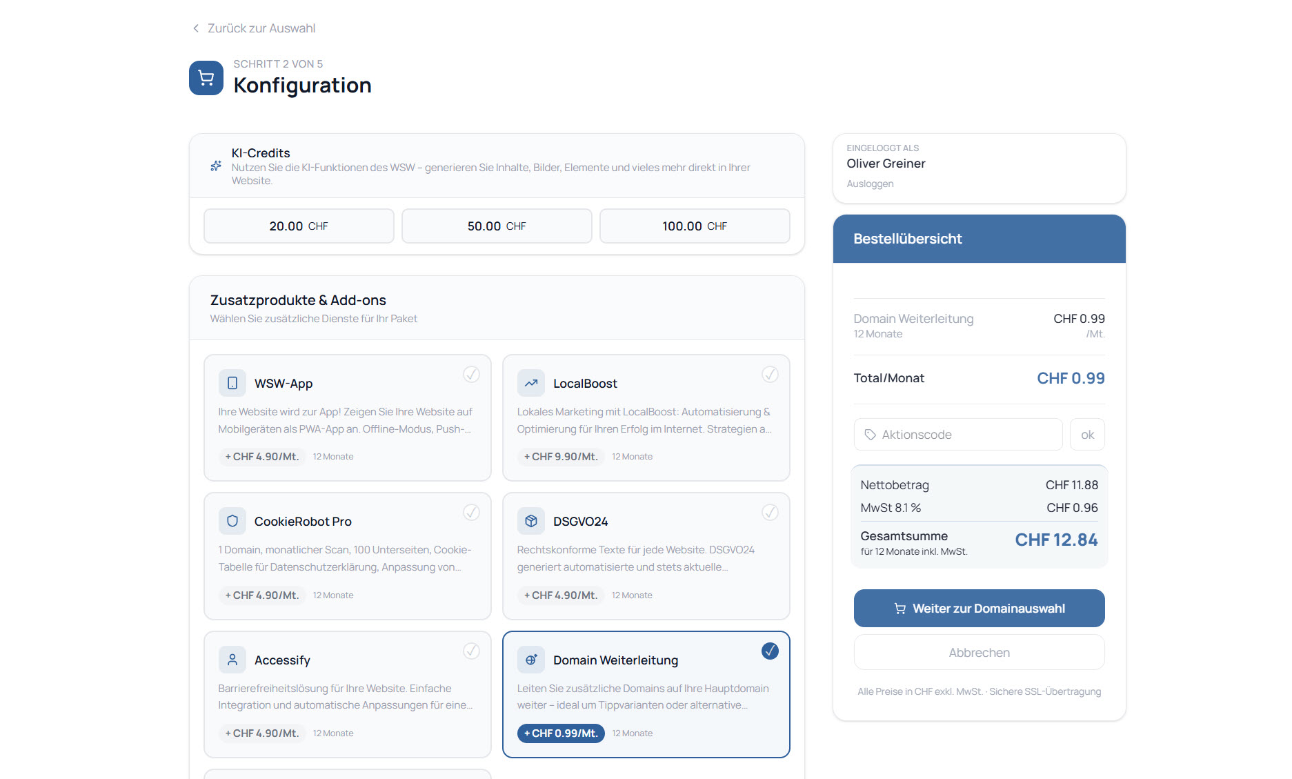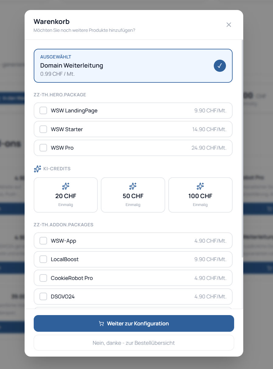 Im nächsten Schritt gelangen Sie in den Warenkorb, wo Sie Ihre Auswahl nochmals überprüfen können. Dort haben Sie auch die Möglichkeit, zusätzliche Leistungen wie KI-Credits oder weitere Add-ons hinzuzufügen. Anschliessend fahren Sie mit „Weiter zur Konfiguration“ fort.