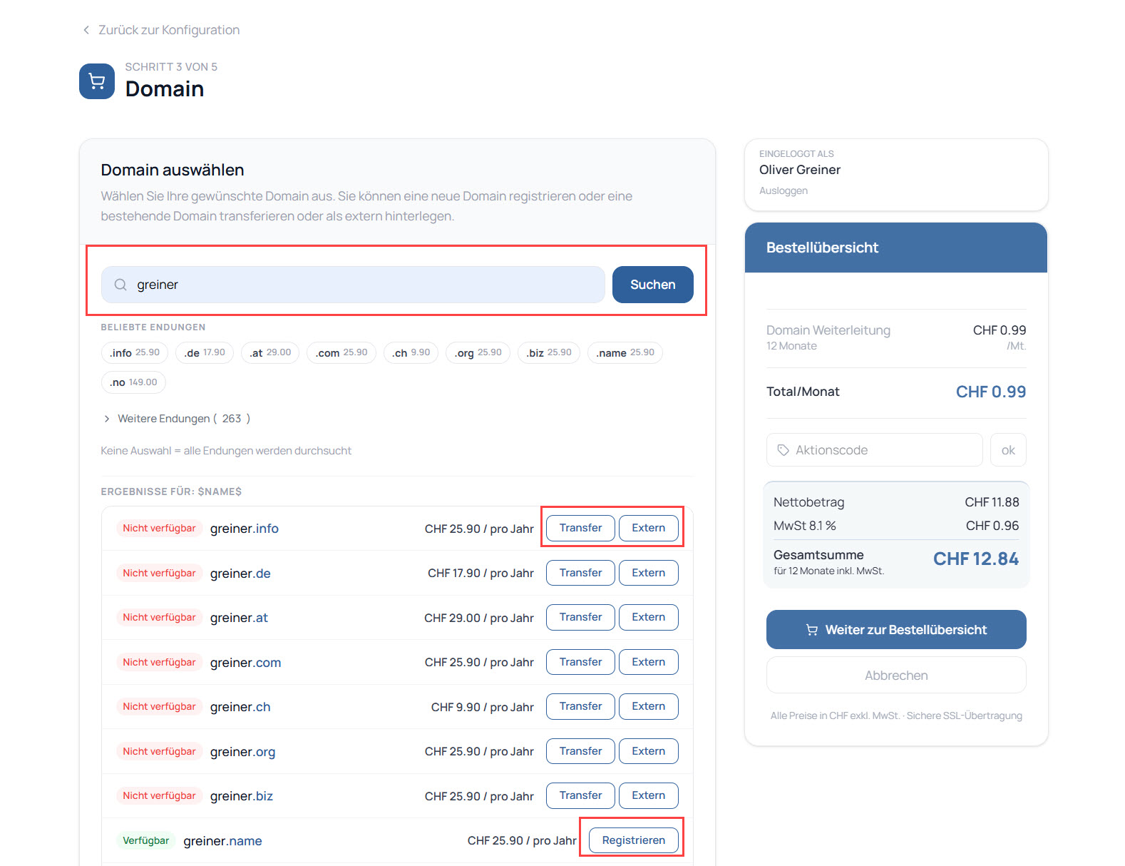 Im nächsten Schritt geben Sie Ihre gewünschte Domain ein und prüfen, ob diese verfügbar ist. Ist die Domain frei, können Sie sie direkt registrieren. Alternativ besteht die Möglichkeit, eine bestehende Domain zu transferieren oder extern zu hinterlegen. Danach gelangen Sie zur Bestellübersicht.