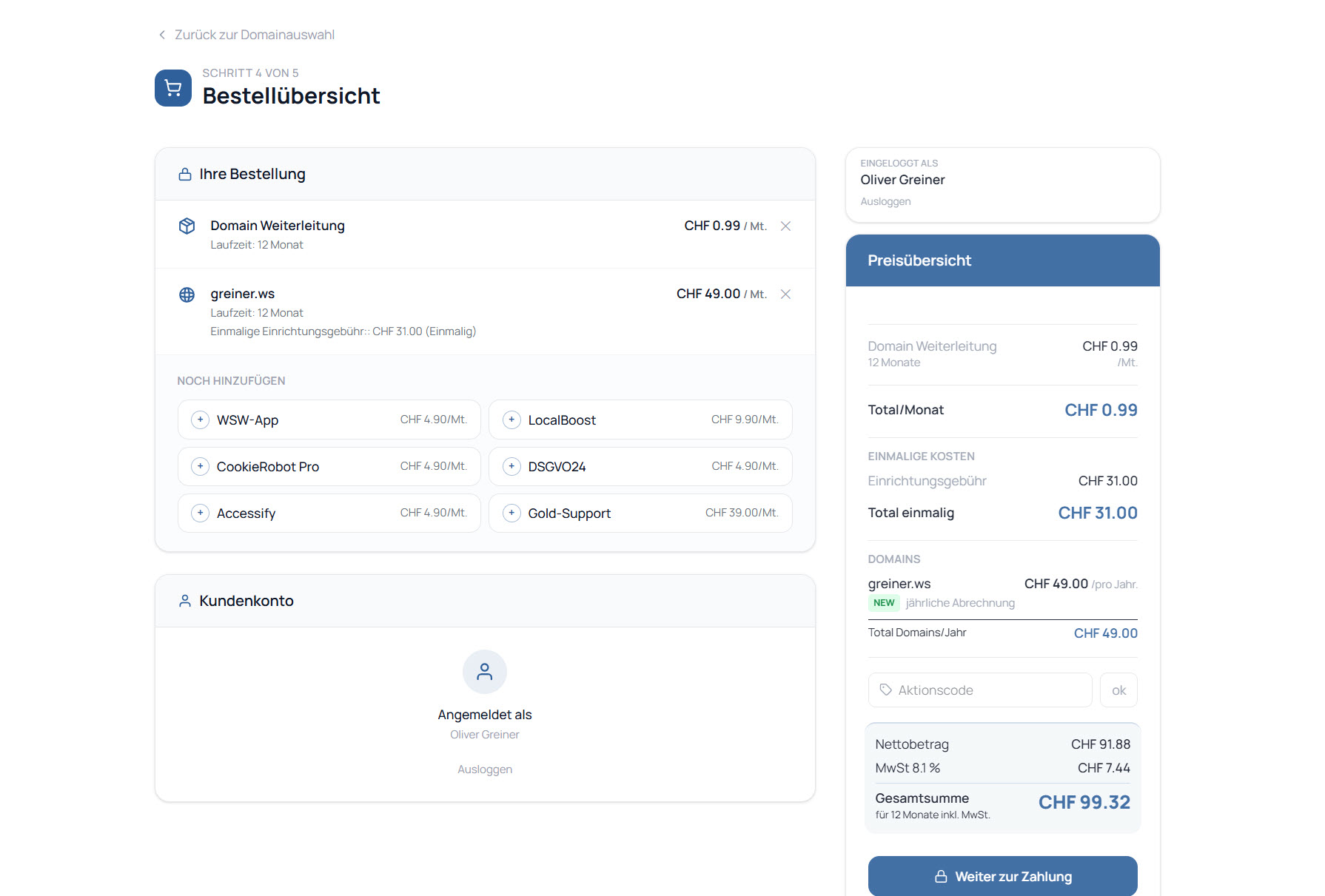 In der Bestellübersicht sehen Sie nochmals alle gewählten Leistungen im Detail, inklusive Paket, Domain, Zusatzoptionen sowie die gesamte Preisübersicht. Da Sie bereits mit einem Kunden eingeloggt sind, können Sie direkt "Weiter zur Zahlung" gehen.